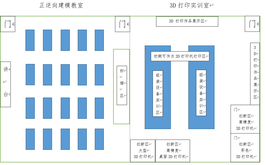 北京某學(xué)院3D打印實(shí)訓(xùn)室 根據(jù)校方要求,我們了解到3D打印實(shí)訓(xùn)室總規(guī)劃面積為200 m2。根據(jù)實(shí)訓(xùn)室的用途,需要采購的設(shè)備,可分為五大區(qū)域 實(shí)訓(xùn)室布局規(guī)劃 根據(jù)校方要求,我們了解到3D打印實(shí)訓(xùn)室總規(guī)劃面積為200 m2。根據(jù)實(shí)訓(xùn)室的用途,需要采購的設(shè)備,可分為五大區(qū)域: 展示區(qū) 三維模型設(shè)計(jì)區(qū) 逆向成型設(shè)計(jì)區(qū) FDM組裝與調(diào)試區(qū) 3D打印創(chuàng)新區(qū) 部分設(shè)備介紹 Artec/EVA 彩色手持三維掃描儀 可提供快速、準(zhǔn)確、肌理豐富的完美3D掃描。掃描過程迅速,色彩鮮亮,分辨率高,幾乎可用于所有場合,且輕便、快捷、多功能 適用于掃描藝術(shù)類等不規(guī)則、大型作品的掃描 FARO?DESIGN SCANARM 高精度三維掃描臂 采用光學(xué)領(lǐng)域中領(lǐng)先的藍(lán)色激光技術(shù),具有極高的掃描速度,可生成高分辨率點(diǎn)云數(shù)據(jù),無需貼點(diǎn) ?? 適用于掃描工業(yè)類等精密零件掃描 YUNS?Y100組裝打印機(jī) 結(jié)構(gòu)簡單,是3D打印入門級設(shè)備,價(jià)格便宜 交由學(xué)生拆裝,了解設(shè)備結(jié)構(gòu),學(xué)習(xí)3D打印成型原理 YUNS Y300桌面FDM打印機(jī) 打印尺寸大,成型速度快,適合中小批量打印 可批量打印學(xué)生創(chuàng)意作品 UNIZ桌面機(jī) DLP樹脂打印,大成型尺寸,高精度打印、高表面質(zhì)量、全自動支撐生成 可直接打印學(xué)生畢業(yè)設(shè)計(jì)等高精度模型 Ultra?3SP 全新的3SP?(掃描、旋轉(zhuǎn)、選擇性光固化)技術(shù),從STL文件快速精準(zhǔn)地打印輸出。使用多腔二極管激光器的操作成本低;最少的材料損耗降低成本。較大的成型空間 工業(yè)級精度,可直接生產(chǎn)出誤差內(nèi)的成型零件 Objet260 樹脂噴射彩色3D打印機(jī),可使用一系列多種材料組件(包括剛性、柔性、透明和耐用組件)創(chuàng)建顏色鮮亮的原型 色彩豐富,成品無需上色 最終結(jié)果 3D打印實(shí)驗(yàn)室功能實(shí)現(xiàn): 設(shè)計(jì)可以在較短的時(shí)間很快實(shí)現(xiàn)并得到驗(yàn)證及完善設(shè)計(jì),充分發(fā)揮設(shè)計(jì)創(chuàng)造力; 結(jié)合3D打印實(shí)驗(yàn)室配置的設(shè)備,可充分有效的將自身設(shè)計(jì)的物品制作出來,創(chuàng)造產(chǎn)品真實(shí)呈現(xiàn)給人們; 基于空間內(nèi)的設(shè)備設(shè)施,可用于創(chuàng)客體驗(yàn)、培訓(xùn)、競賽、技術(shù)交流等; 整個(gè)制作過程在3D打印實(shí)驗(yàn)室內(nèi)完成,可用于教學(xué),提升人員自身技能及拓寬生產(chǎn)制造思路。 更多詳情請點(diǎn)擊——教育科研 上一頁 下一頁