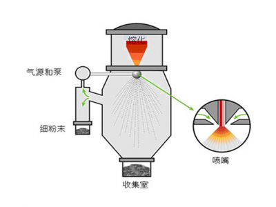 氣霧化制粉法是常見的粉末生產(chǎn)方法。元素原料在空氣或惰性氣體包層下或在真空下熔融。隨后用氣體回填該室,以迫使熔融合金通過高速空氣、氮、氦或氬氣體沖擊流動熔體并將其分解的噴嘴。粉末大多呈球形,其中存在一些不對稱的顆粒及伴生物。伴生物是在固化期間較小的顆粒粘附到較大的顆粒時形成的。爐容量范圍為5千克至3000千克。 尺寸范圍為0至500微米。在20到150微米范圍內(nèi)的產(chǎn)量在總產(chǎn)量的10至50%之間波動。主要用于鎳、鈷和鐵的合金,也可用于鈦和鋁合金。